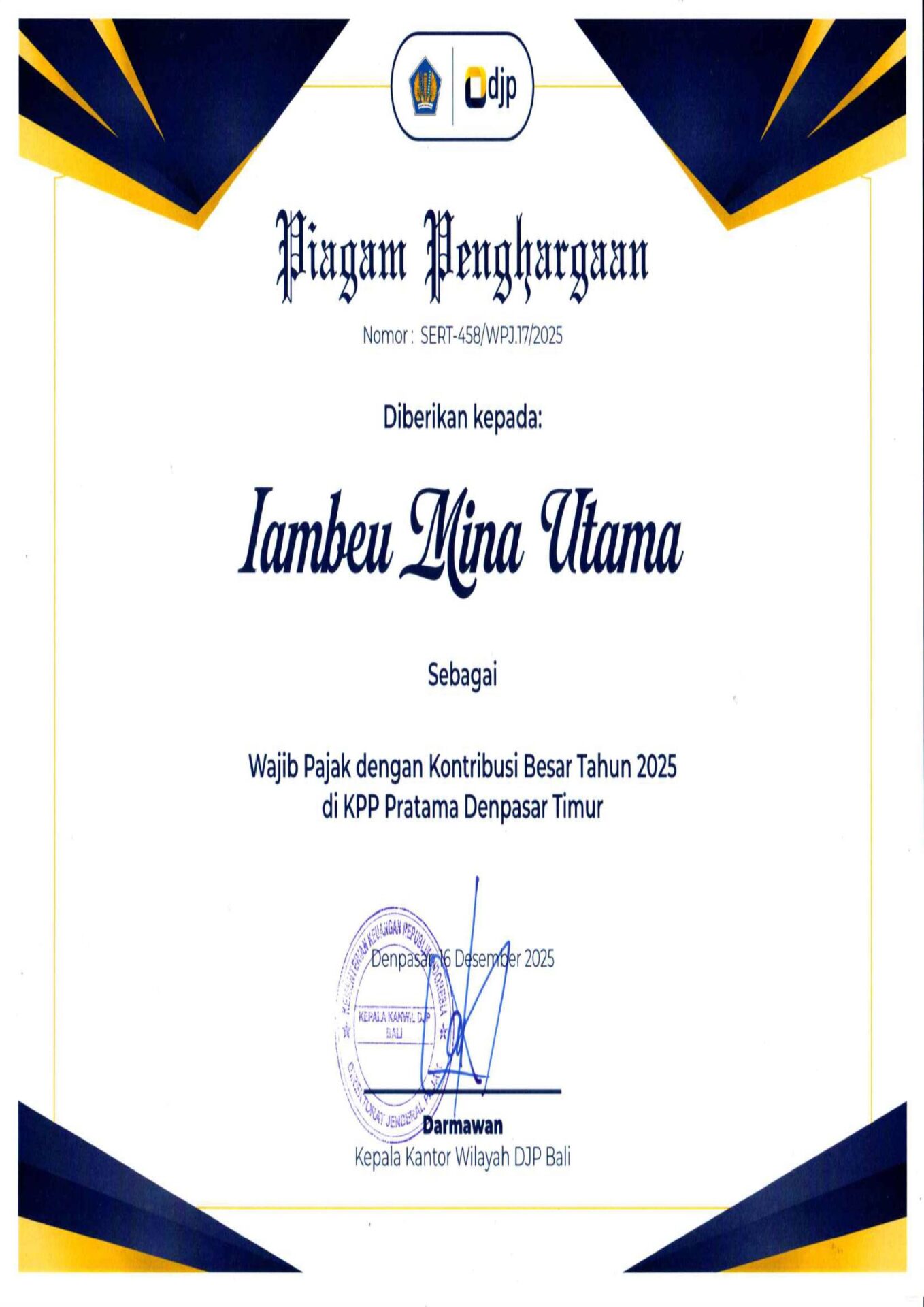Acara penyerahan penghargaan tersebut dihadiri oleh Komisaris Utama PT Iambeu Mina Utama, Fransisca Pramushinta, S.T., yang didampingi oleh Sekretaris Perusahaan, I Gusti Ayu Yuliantari Dewi, S.E., M.Si. Penghargaan ini ditetapkan pada 16 Desember 2025 sebagai bentuk apresiasi atas kepatuhan serta kontribusi signifikan perusahaan dalam memenuhi kewajiban perpajakan.
